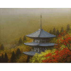 奈良県の當麻寺、手前には美しい紅葉を描いた1枚でございます。