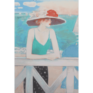 美しい女性が海沿いのテラスでたたずむ姿が描かれます。